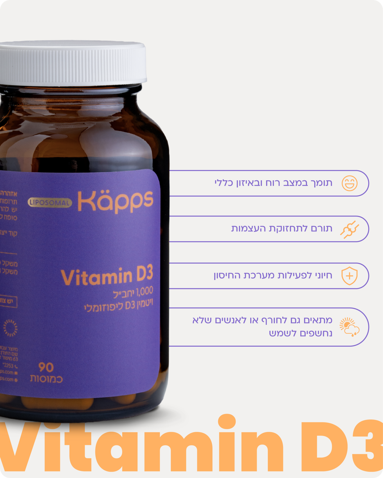 תוסף תזונה המכיל ויטמין D3 בטכנולוגיה ליפוזומלית הוא ויטמין חיוני, המוכר בתרומתו לתמיכה בתהליכים פיזיולוגיים תקינים בגוף, כולל תפקוד תקין של מערכת החיסון ותחזוקת בריאות העצם.