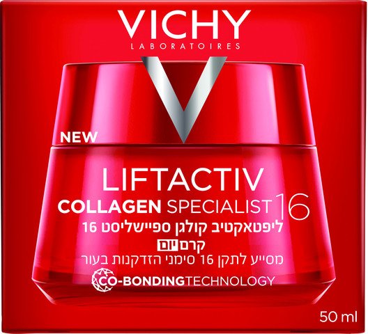 Vichy Liftactiv Collagen Specialist 16 Day Cream הוא קרם יום מתקדם המיועד לשיפור מוצקות העור ולהפחתת סימני הזדקנות הנגרמים מירידה טבעית בייצור הקולגן. הפורמולה העוצמתית, המבוססת על פפטידים וויטמין Cg, מסייעת בהחלקת קמטים, חיזוק מראה העור והענקת זוהר טבעי לאורך היום. מרקם נעים ונספג במהירות, מתאים לכל סוגי העור — כולל רגיש — ומשאיר את העור חלק, קורן ומוצק יותר כבר מהשימושים הראשונים.