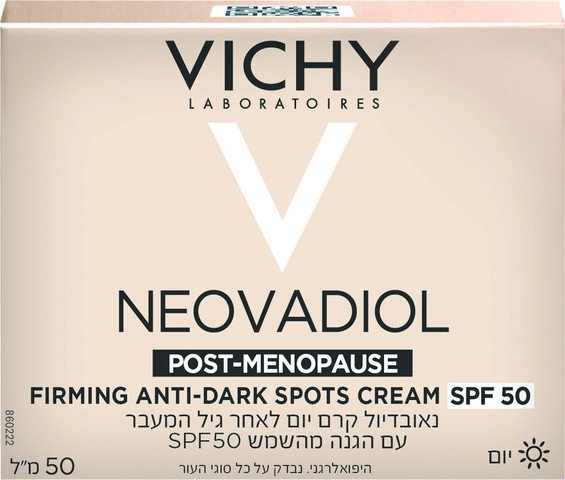 Vichy Neovadiol Firming Anti‑Dark Spots Cream SPF 50 הוא קרם יום עוצמתי המיועד לנשים בגיל המעבר, המשלב מיצוק, הבהרת כתמים והגנה גבוהה מהשמש במוצר אחד. הפורמולה המחזקת מסייעת לשפר את גמישות העור, לטשטש כתמי גיל ולמנוע הופעת כתמים חדשים, תוך הענקת לחות ונוחות לאורך כל היום. מרקם נעים ונספג במהירות הופך אותו לפתרון אידיאלי לשגרת בוקר שמעניקה לעור מראה מוצק, אחיד ומואר.